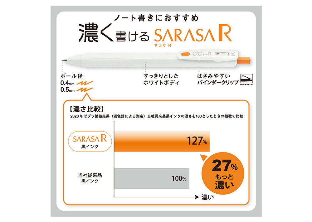 ※2020年ゼブラ試験結果(測色計による測定)サラサRの黒インクと当社従来品黒インクの濃さを比較した数値。