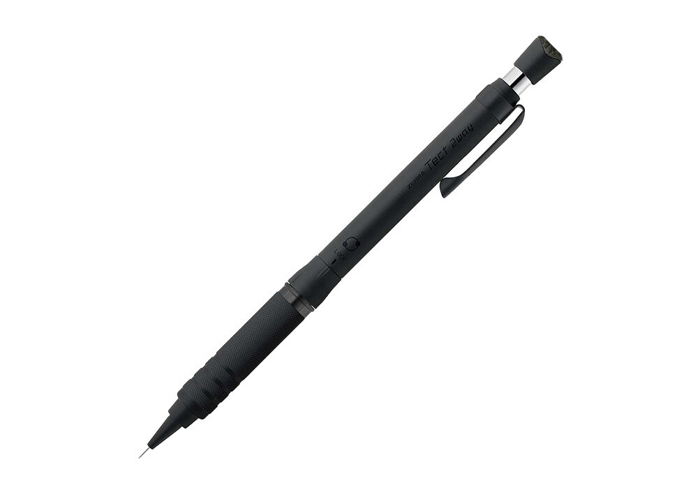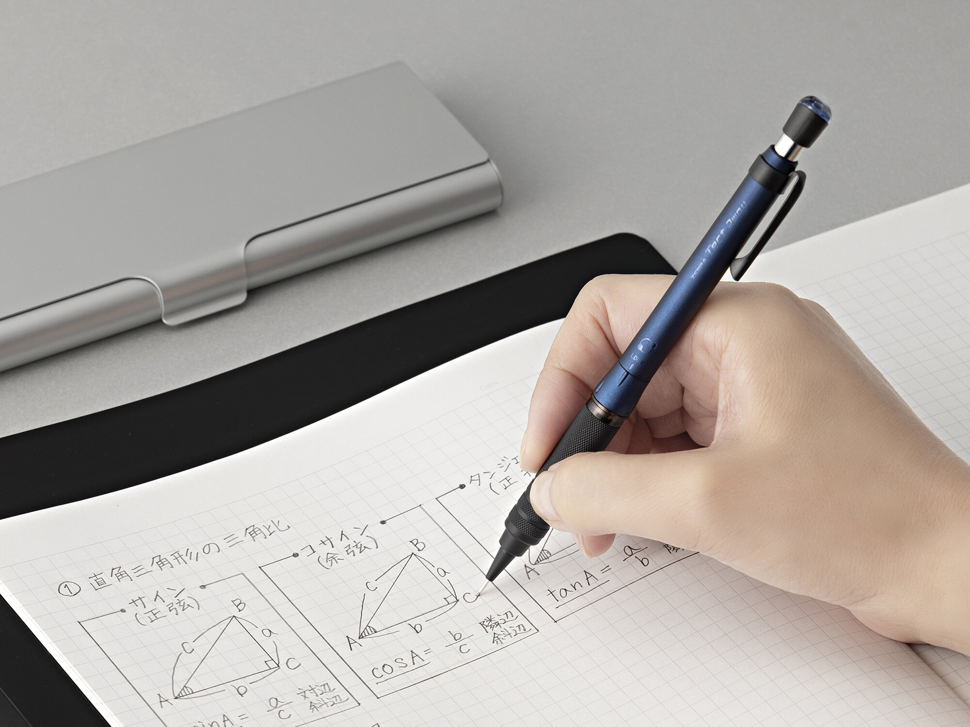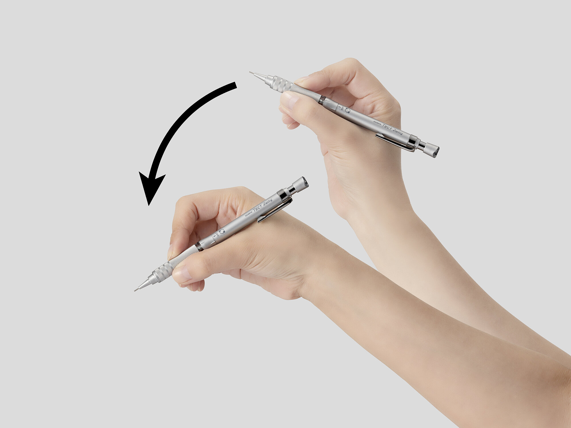 振って芯を出すフリシャ機能と、フリシャ機能をロックできる切替機構、低重心は従来の「テクトツゥーウェイ」そのままに、落ち着いた軸色、さりげないロゴ印刷、マットな質感を基調にした上質感あるデザインにアップデートしました。